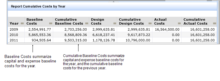 - Cost reports: Reports generated for Costs show baseline vs. design vs. actual costs. There is a column for each cost type. The Baseline Costs, Design Costs, or Actual Costs columns sum these respective costs for actions from the Action Items table for the report's time frame and grouping. The Cumulative column sums costs for the current time frame plus the previous time frame. For example, if you generate the report for a year, the Cumulative Baseline Costs column shows baseline costs for that year plus the cumulative baseline costs for the previous year.