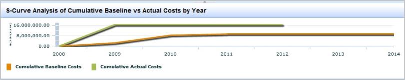 The following screen shot shows a line graph comparison of cumulative baseline costs vs. cumulative design costs for a project by year: